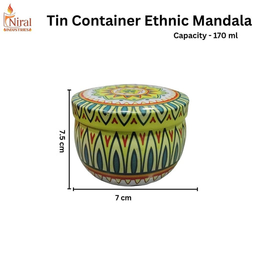 Niral IndustriesElegant tin container featuring intricate ethnic mandala designs, perfect for storing candles, wax, or craft supplies. This 170 ml capacity vessel ...
