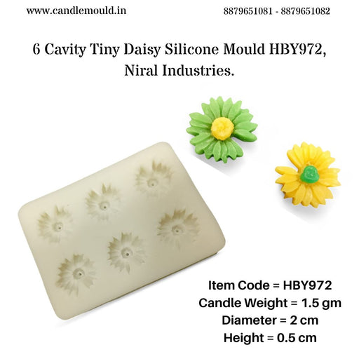 Niral IndustriesItem Code = HBY972 Candle Weight = 1.5 gm Diameter = 2 cm Height = 0.5 cm The 6 Cavity Tiny Daisy Silicone Mould is a flexible and durable mo...