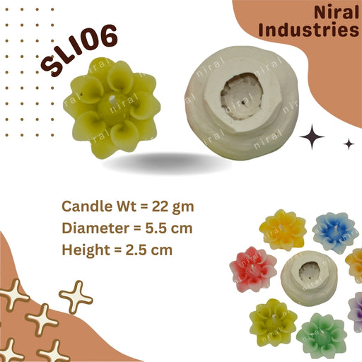 Niral IndustriesItem Code = SL106 Candle Weight = 8 gms Diameter = 4.5 cm Height = 2 cm Light up your living space with this Sunny Blooms Silicone Candle Mold! ...