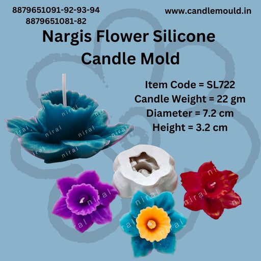 Niral IndustriesItem Code = SL722 Candle Weight = 22 gm Diameter = 7.2 cm Height = 3.2 cm The "Nargis Flower Candle Mould" is a silicone mold designed to create...