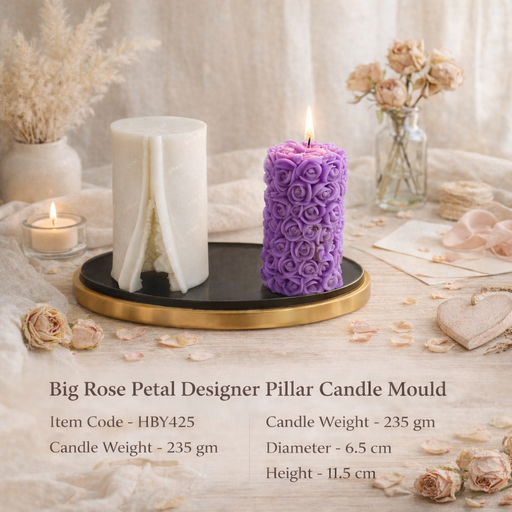 Niral IndustriesItem Code - HBY425Candle Weight - 235 gmDiameter - 6.5 cmHeight - 11.5 cmThe "Big Rose Petal Designer Pillar Candle Mould" is a unique and intricat...