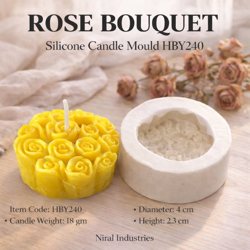 Niral IndustriesItem Code - HBY910Candle Weight - 12 gmDiameter - 4.5 cmHeight - 2 cm This Flower Bouquet Silicone Mould allows you to create beautiful and intrica...