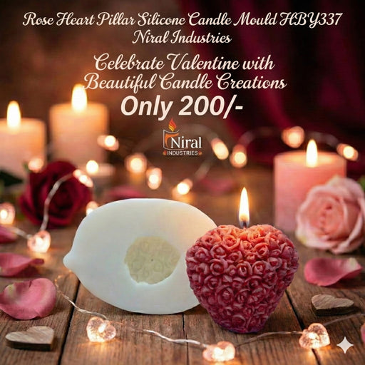 Niral IndustriesItem Code = HBY337 Candle Weight = 85 gm Diameter = 7 x 4.5 cm Height = 6 cm The "Rose Heart Pillar Silicone Candle Mould" is a versatile and du...