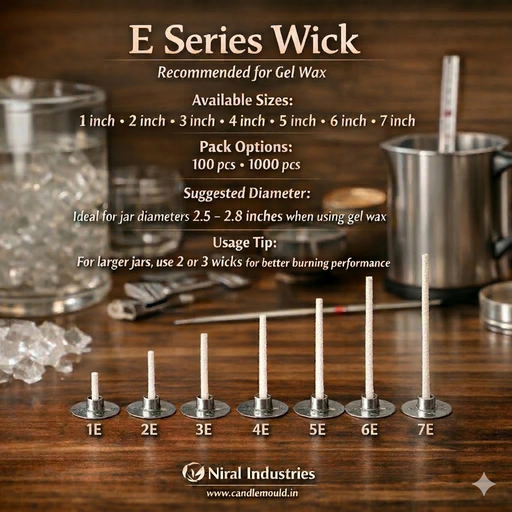 Niral IndustriesE Series Wick Recommended for Gel Wax Available Sizes: 1 inch , 2 inch , 3 inch , 4 inch , 5 inch , 6 inch , 7 inch Available Pack Options: 100 pcs...