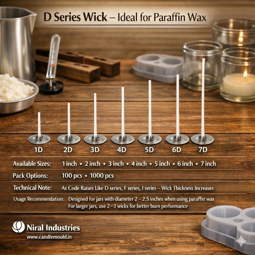 Niral IndustriesD Series Wick Recommended for Paraffin Wax Available Sizes: 2 inch , 3 inch , 4 inch , 7 inch Available Pack Options: 100 pcs , 1000 pcs Suggested ...