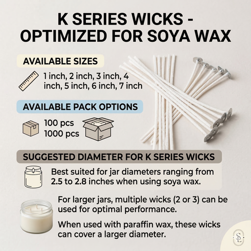 Niral IndustriesK Series Wick Recommended for Soya Wax Available Sizes: 1 inch , 2 inch , 3 inch , 4 inch , 5 inch , 6 inch , 7 inch Available Pack Options: 100 pc...
